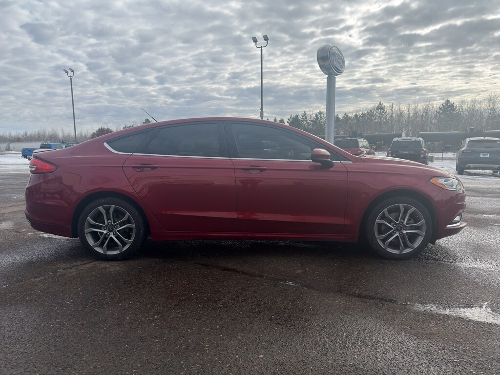 Just the right size to accommodate all your needs. It has room for passengers and plenty of trunk space. The vehicle keeps you comfortable with Auto Climate. The high efficiency automatic transmission shifts smoothly and allows you to relax while driving. Protect this 2017 Ford Fusion from unwanted accidents with a cutting edge backup camera system. Maintaining a stable interior temperature in this Ford Fusion is easy with the climate control system. This mid-size car features cruise control for long trips. Electronic Stability Control is one of many advanced safety features on this mid-size car. This Ford Fusion has a 4 Cyl, 2.0L high output engine. It has fog lights for all weather conditions. Front wheel drive on this unit gives you better traction and better fuel economy. The Ford Fusion is equipped with a gasoline engine. This vehicle features a hands-free Bluetooth phone system. Help alleviate lower back pain with the driver seat lumbar support in this vehicle. The state of the art park assist system will guide you easily into any spot. This mid-size car looks aggressive with a streamlined rear spoiler. This model gleams with a flashy red exterior.